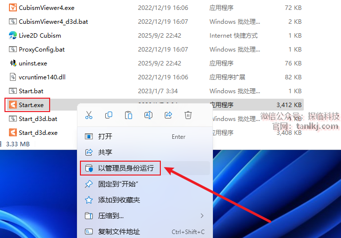 右键刚刚粘贴的文件【Start】,点击【以管理员身份运行】。