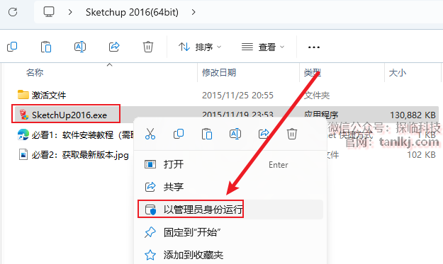 打开解压后的文件夹,右键程序【SketchUp2016】,点击【以管理员身份运行】。
