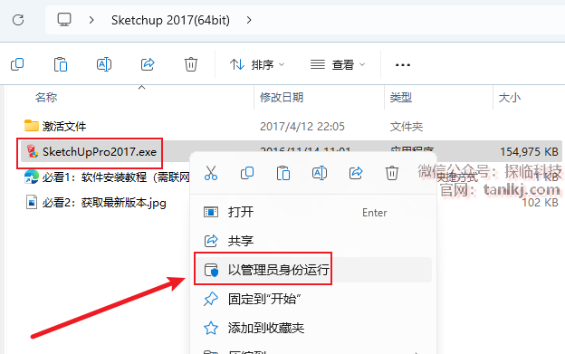 打开解压后的文件夹,右键程序【SketchUpPro2017】,点击【以管理员身份运行】。