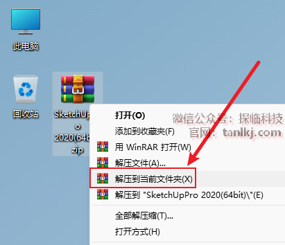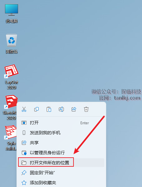 在桌面,右键软件【SketchUp 2020】,点击【打开文件所在的位置】。