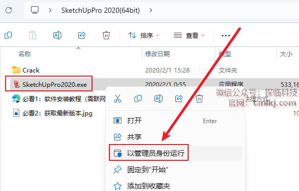 打开解压后的文件夹,右键程序【SketchUpPro2020】,点击【以管理员身份运行】。