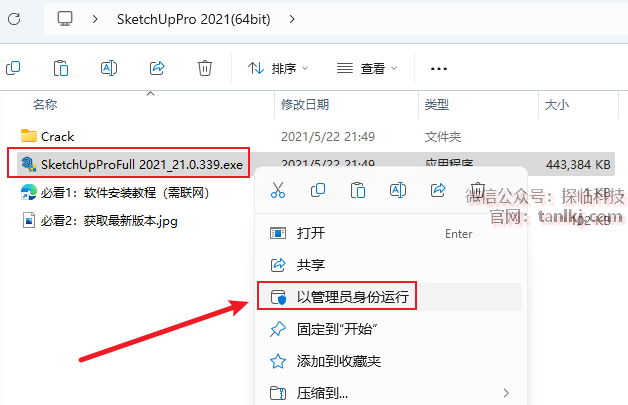 打开解压后的文件夹,右键程序【SketchUpProFull…】,点击【以管理员身份运行】。