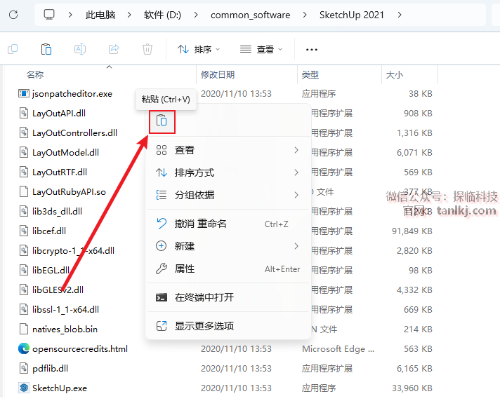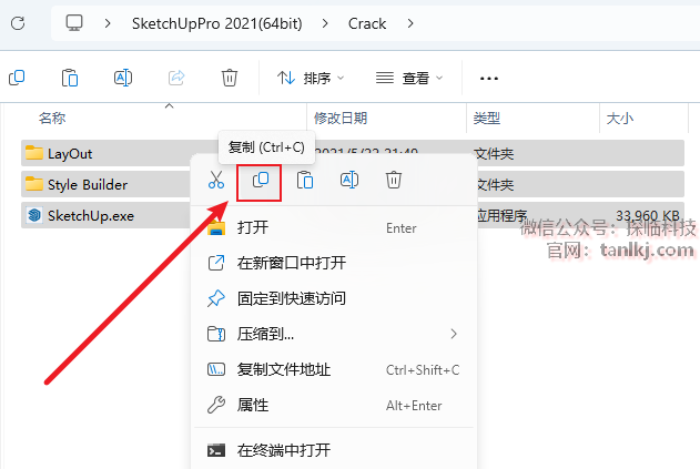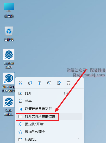 在桌面,右键软件【SketchUp 2021】,点击【打开文件所在的位置】。