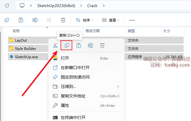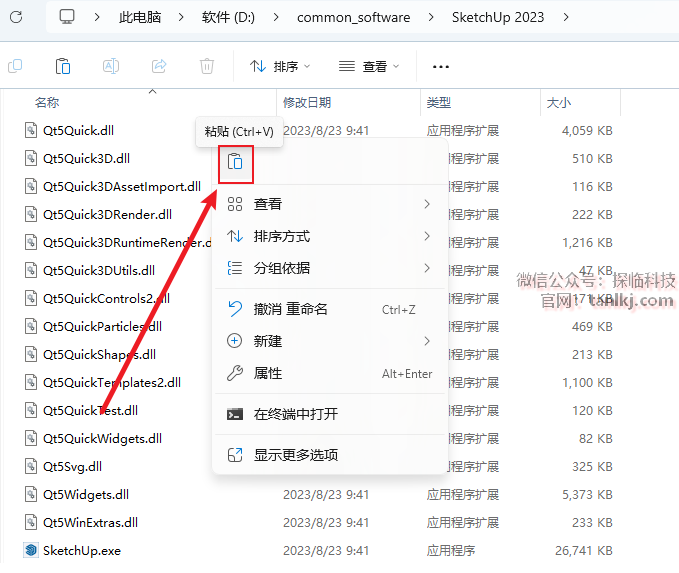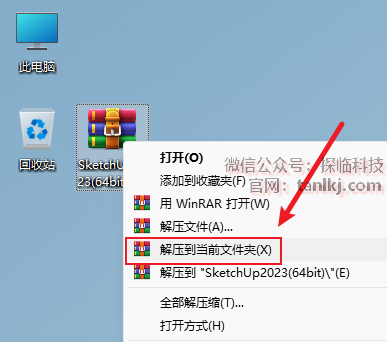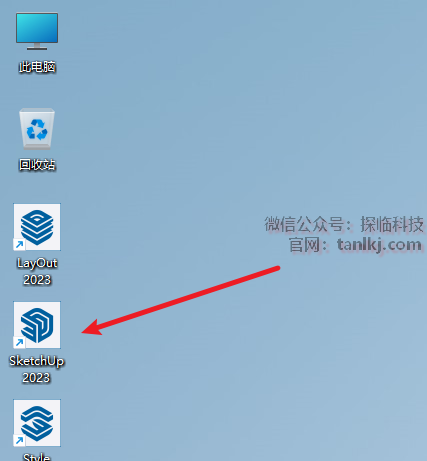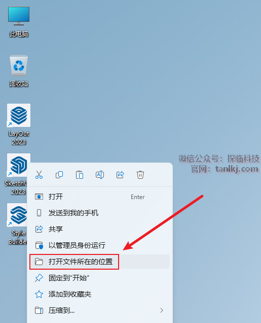在桌面,右键软件【SketchUp 2023】,点击【打开文件所在的位置】。