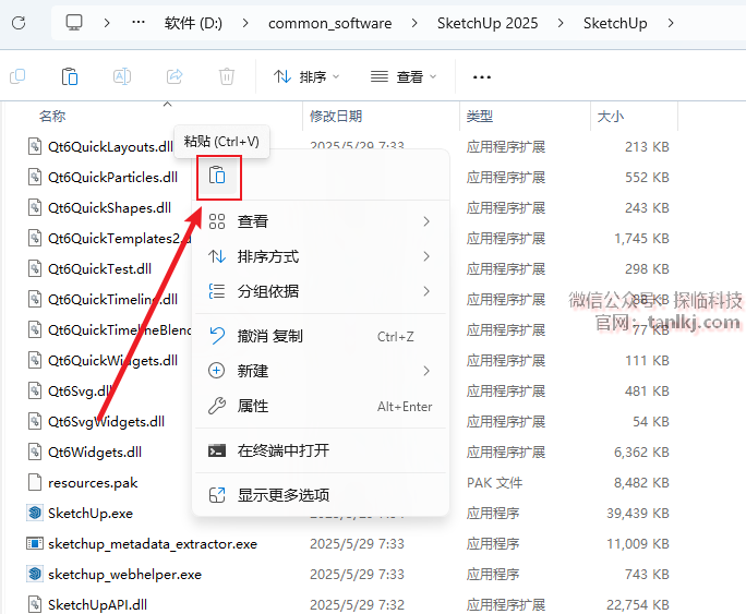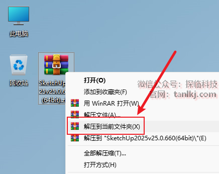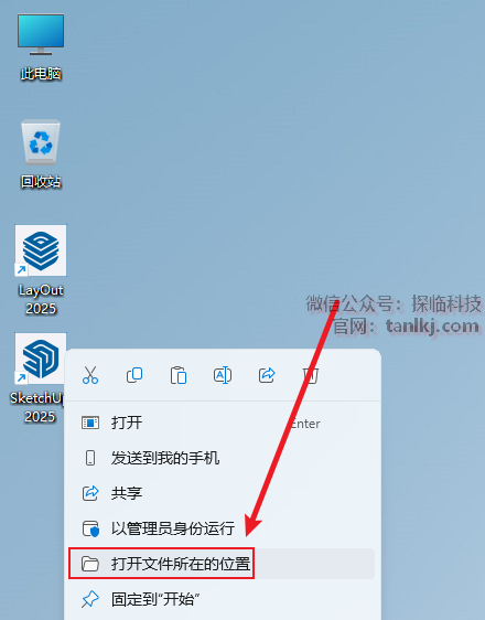 在桌面,右键软件【SketchUp 2025】,点击【打开文件所在的位置】。