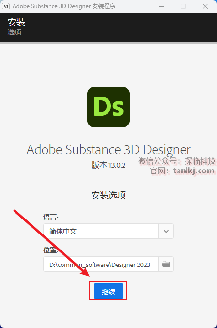 更改软件默认的安装位置,如不需更改,直接点击【继续】即可。