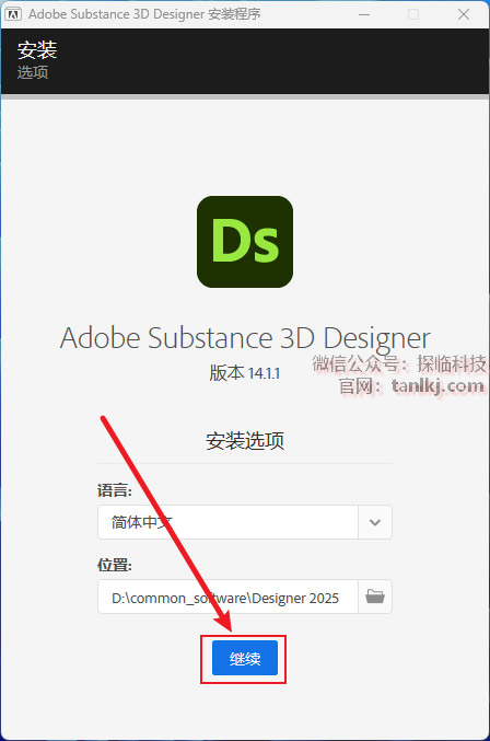 更改软件默认的安装位置,如不需更改,直接点击【继续】即可。