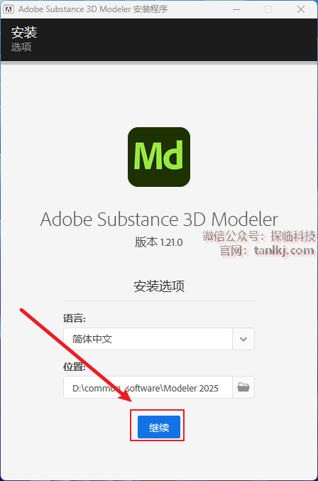 更改软件默认的安装位置,如不需更改,直接点击【继续】即可。