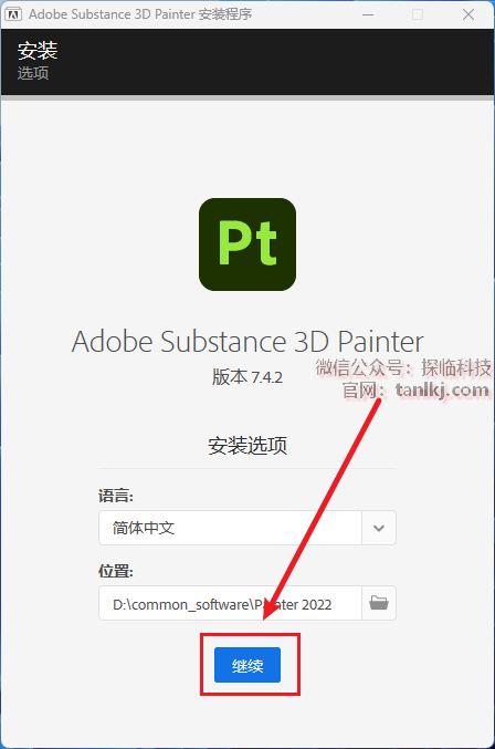 更改软件默认的安装位置,如不需更改,直接点击【继续】即可。