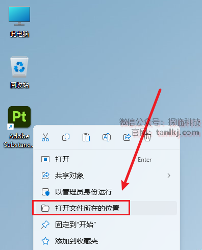 在桌面,右键软件【Adobe Substance 3D Painter】,点击【打开文件所在的位置】。