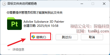 如若提示权限问题,直接点击【继续】即可。如果没有,忽略此步骤。