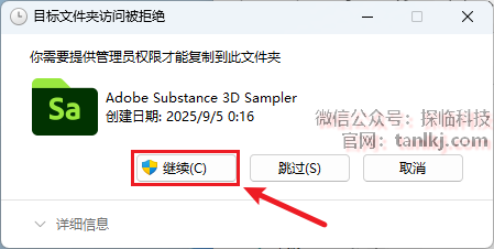 如若提示权限问题,直接点击【继续】即可。如果没有,忽略此步骤。