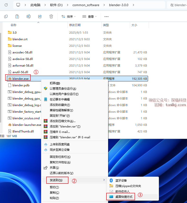 右键程序【blender】,点击【发送到】(win11需先点击【更多选项】),点击【桌面快捷方式】。