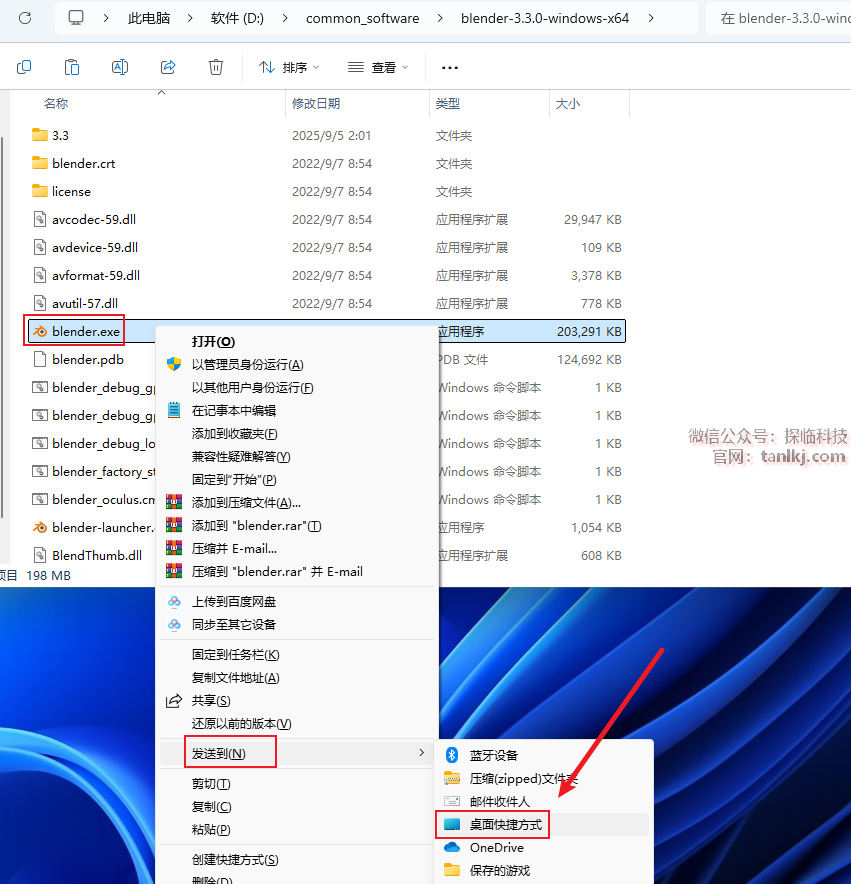 创建软件桌面快捷方式,右键程序【blender】,点击【发送到】(win11需先点击【更多选项】),点击【桌面快捷方式】。