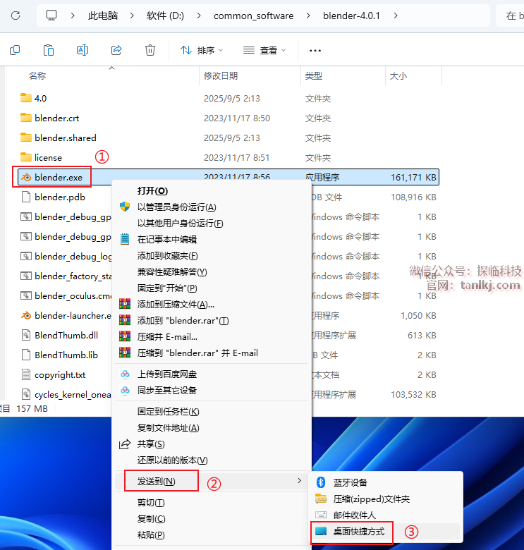 创建软件桌面快捷方式,右键程序【blender】,点击【发送到】(win11需先点击【更多选项】),点击【桌面快捷方式】。