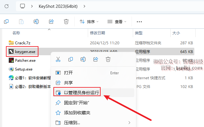 回到之前解压后的文件夹内,右键程序【keygen】,点击【以管理员身份运行】。