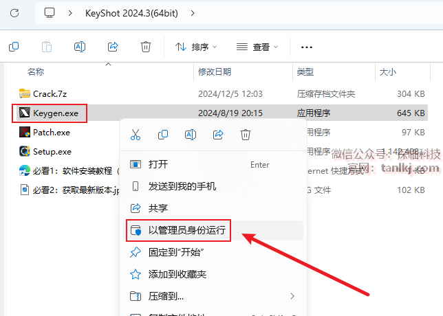 回到之前解压后的文件夹内,右键程序【keygen】,点击【以管理员身份运行】。