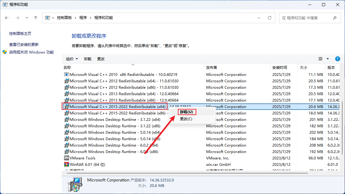 打开控制面板->程序->程序和功能,卸载 Microsoft Visual C++ 2015-2022 Redistributable (x64)。卸载完成后即可正常安装。