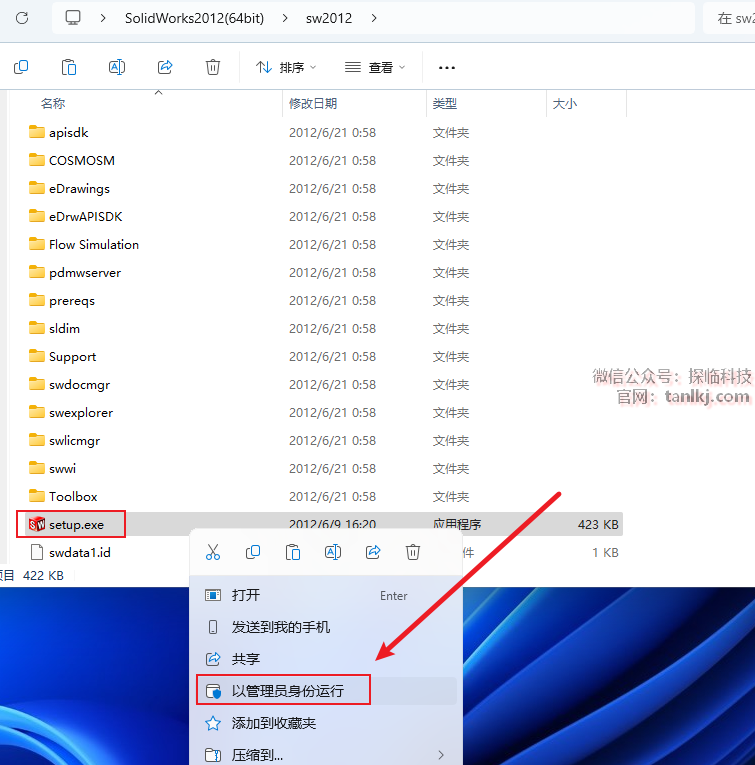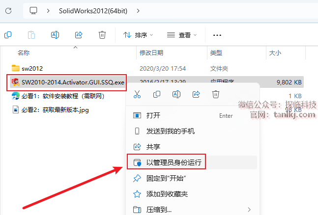 打开之前解压后的文件夹,右键程序【SW2010-2014…】,点击【以管理员身份运行】。