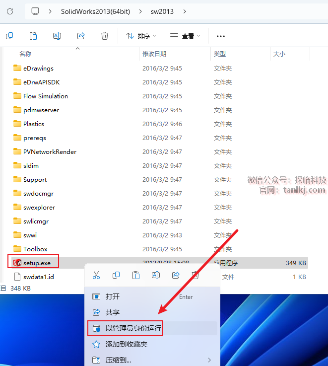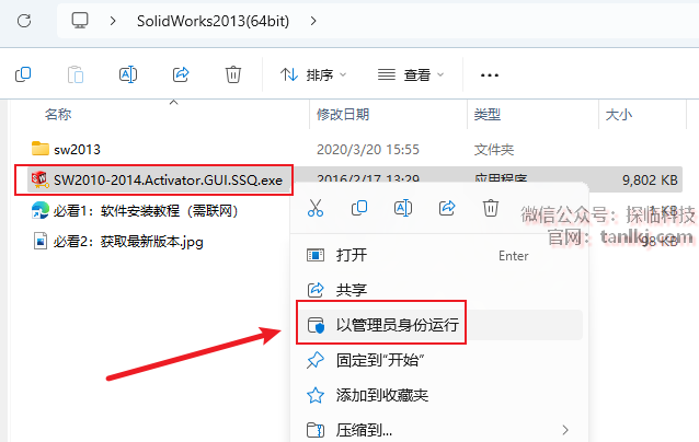 打开之前解压后的文件夹,右键程序【SW2010-2014…】,点击【以管理员身份运行】。