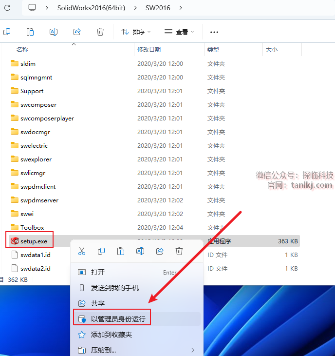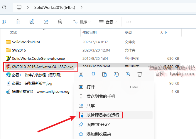 打开之前解压后的文件夹,右键程序【SW2010-2016…】,点击【以管理员身份运行】。