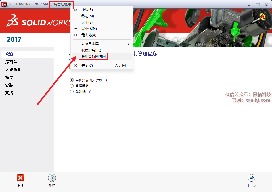 右键窗口最上方位置,点击【禁用英特网访问】。