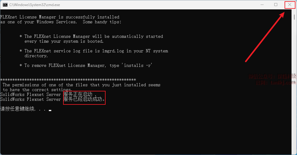 提示:启动成功字样后,点击右上角的【X】关闭窗口。