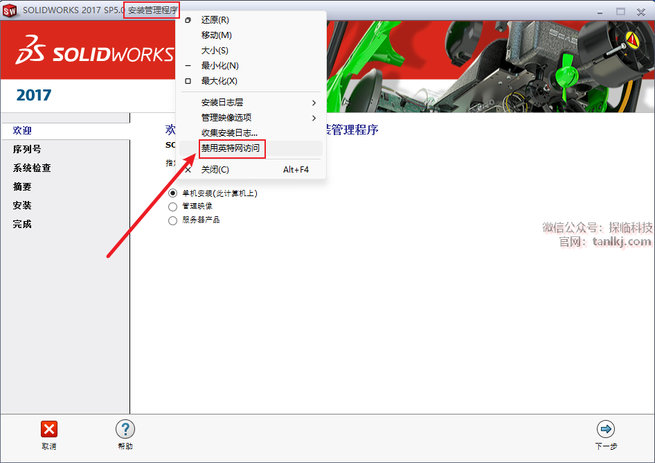 右键窗口最上方位置,点击【禁用英特网访问】。