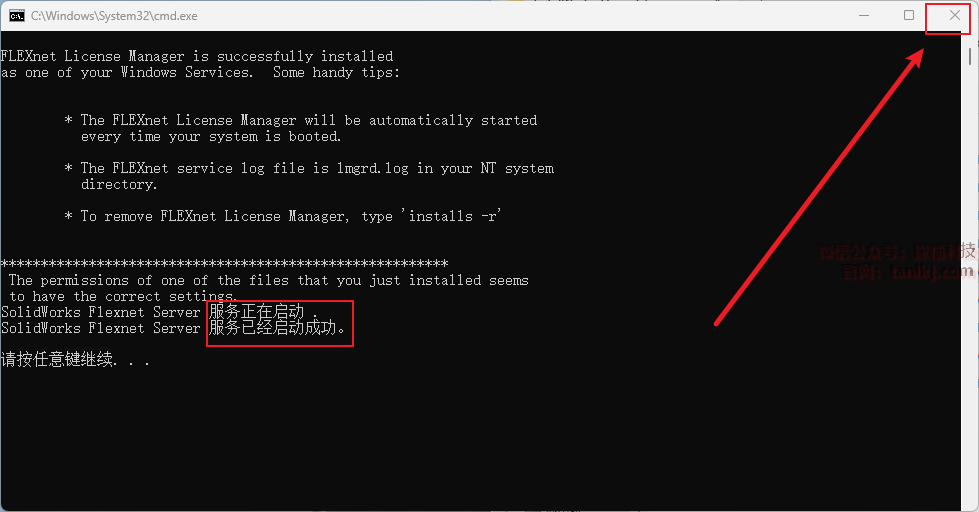 提示:启动成功字样后,点击右上角的【X】关闭窗口。