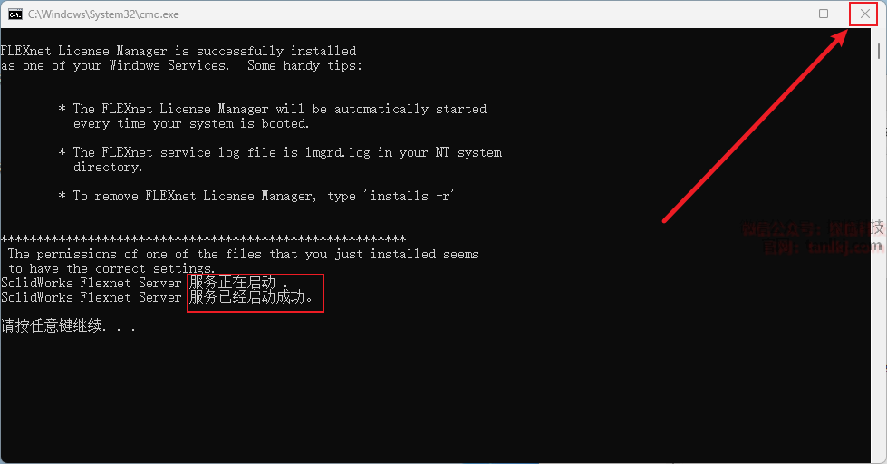 提示:启动成功字样后,点击右上角的【X】关闭窗口。