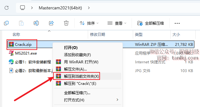 打开之前解压后的文件夹,右键压缩文件【Crack】,点击【解压到当前文件夹】。