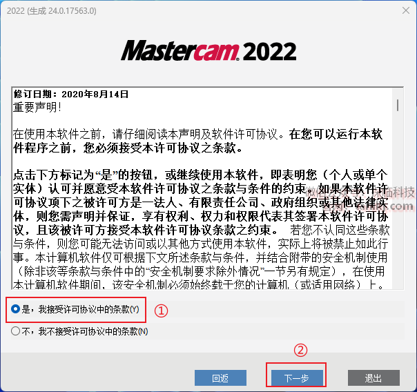 ①勾选【是,我接受许可协议中的条款】;