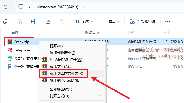 打开之前解压后的文件夹,右键压缩文件【Crack】,点击【解压到当前文件夹】。