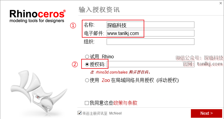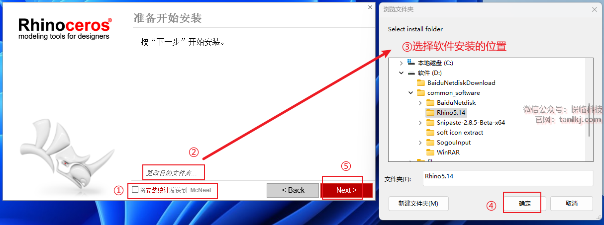 更改软件默认安装位置,如不需更改,去掉勾选【将安装统计发送到 McNeel】后点击【Next】即可。