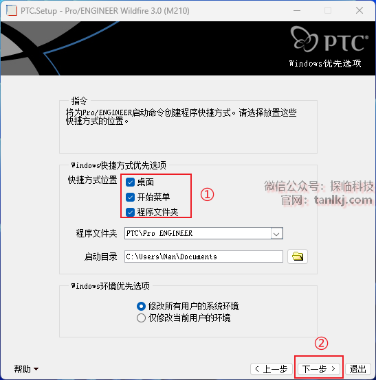 ①勾选【桌面】、【开始菜单】、【程序文件夹】;
