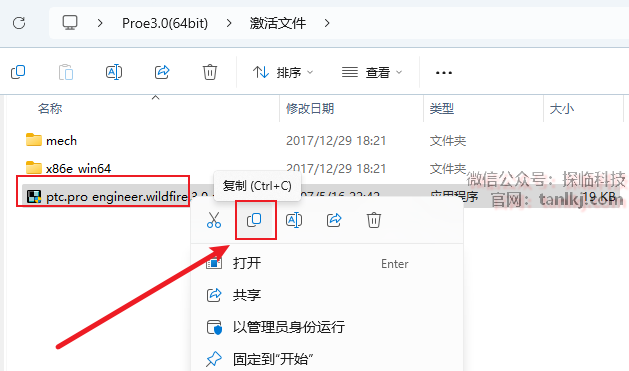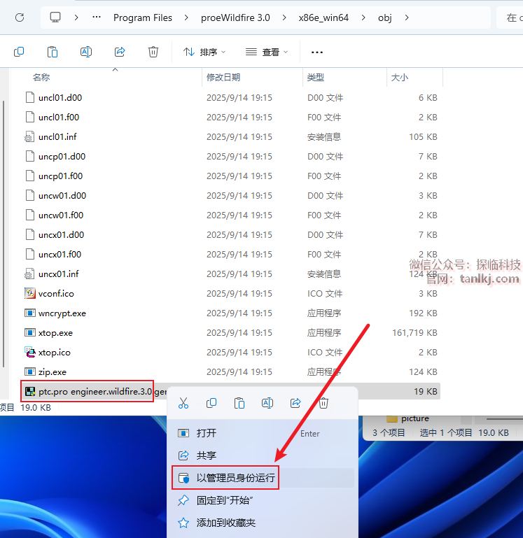 右键刚刚粘贴的文件【ptc.pro…】,点击【以管理员身份运行】。
