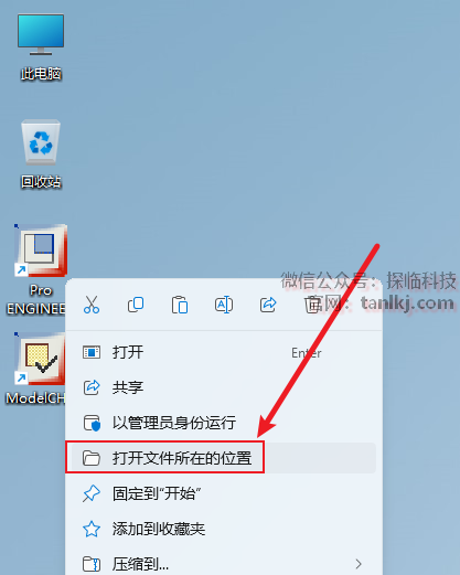 在桌面,右键软件【Pro ENGINEER】,点击【打开文件所在的位置】。