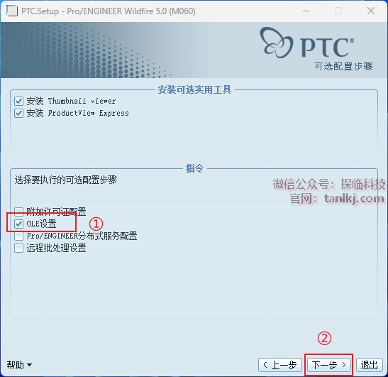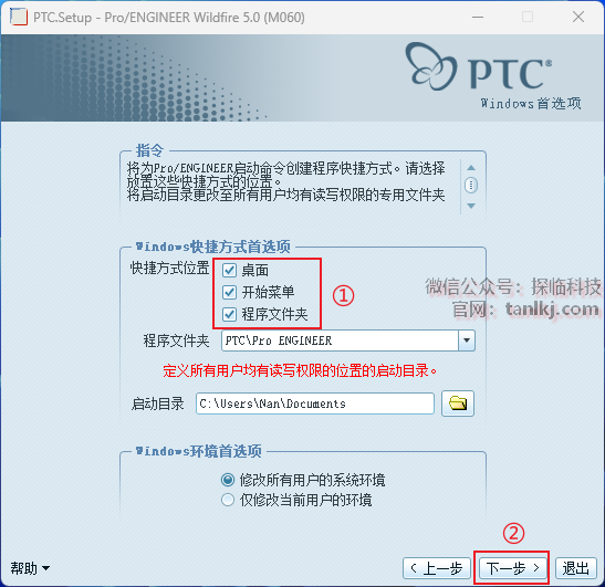 ①勾选【桌面】、【开始菜单】、【程序文件夹】;