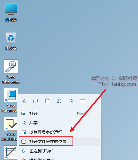 在桌面,右键软件【Creo Parametric 5.0.0.0】,点击【打开文件所在的位置】。