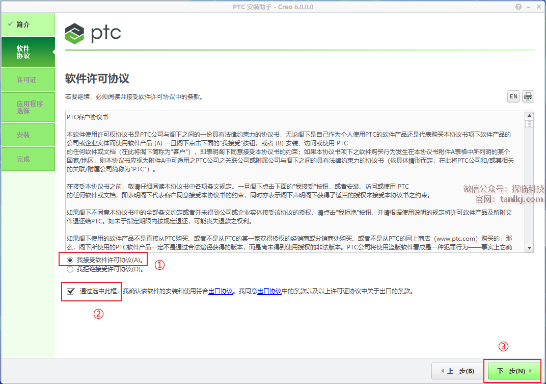 ①勾选【我接受软件许可协议】;