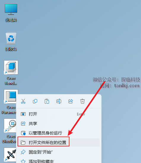 在桌面,右键软件【Creo Parametric 6.0.0.0】,点击【打开文件所在的位置】。